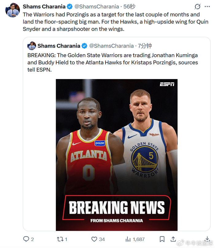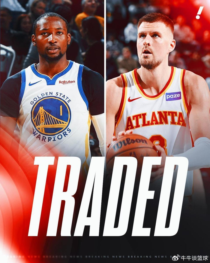NBA常规赛继续进行。根据名记Shams的报道称,勇士队和老鹰队达成一笔2换1交易,勇士队送出库明加和希尔德,从老鹰队得到波尔津吉斯!随后勇士队和猛龙队达成交易,送走戴维斯到猛龙队,换回来自湖人今年的次轮!