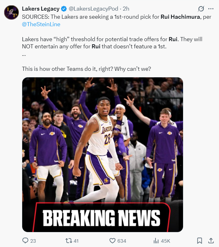 根据NBA记者马克-斯坦恩的报道,湖人队正在评估八村的交易价值,他们的要价至少是一个首轮签。湖人对涉及八村的交易有着很高的要求,他们绝对不会接受没有首轮签的任何交易提议。