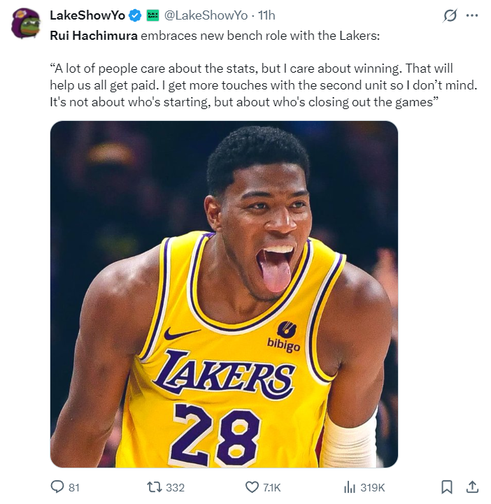 八村垒赛后接受采访,他盛赞了这个团队能看出他很不愿意离开LAL,他说道:我 要表扬我的教练,教练在会议上跟他们谈过了,让勒布朗、卢卡要多给队友球,他们也确实这样做了,他们总是接受教练的建议,所以我们能赢球,每个人都可以触球,每个人都能积极参与进攻,这才是篮球该有的样子。