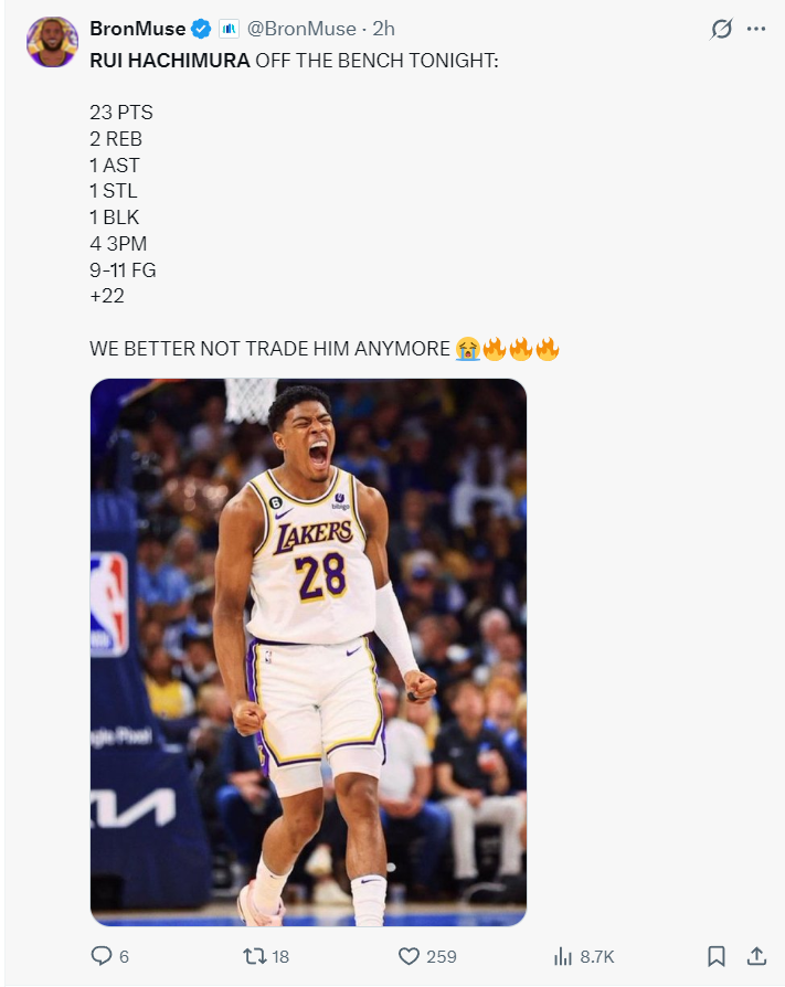 湖人媒体:此役打完后大家觉得八村是否值得球队长期留用?还是说湖人该在交易截止日前利用他的合同进行交易换取更好的球员?还是继续留着跟他续约?